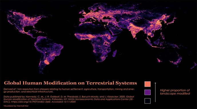 Figure 2: A map showing the extent of human modifications on the surface of Earth. Credit: Hannah Ker
